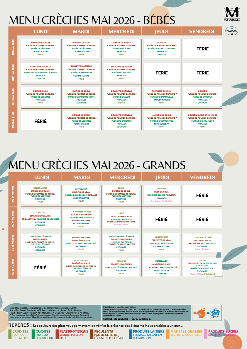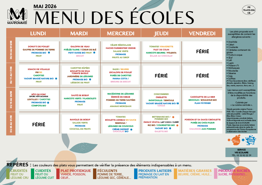 Actualité MENU DES ÉCOLES & DES CRÈCHES – MAI 2026 Publié par Ville de Maromme le 28 avril 202628 avril 2026